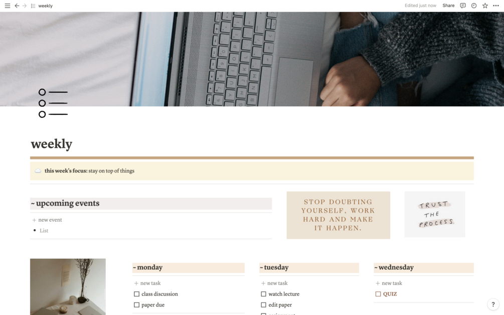 You'll get an aesthetic weekly template with inspiring quotes and a place to put reminders/events!